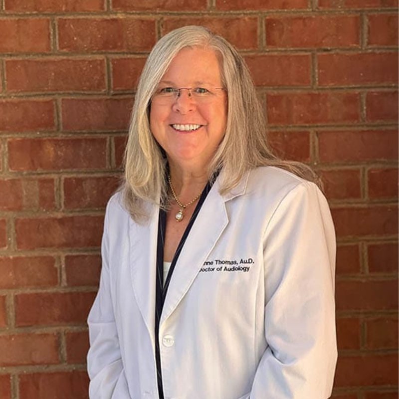 Dr. G'Anne Thomas has served Northeast Georgia communities since 1988, founding Hearing + Balance Clinics in 2003 after working extensively with ENT physicians. With 30 years of experience and specialized certifications, she provides comprehensive hearing care, including assessments, hearing aid fittings, tinnitus management, and balance disorders. A founding member of the American Academy of Audiology, Dr. Thomas balances her professional dedication with personal interests in travel, time with grandchildren, and creating fused glass art.